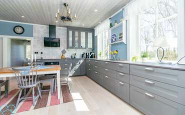 Die Wohnfläche des Hauses beträgt ca. 370 m² und bietet Platz für bis zu 15 Personen. Nach dem Betreten des Ferienhauses befindest du dich in einem großen Flur mit Garderobe. Nach rechts geht es in einen kleinen Arbeitsraum mit Schreibtisch. Gegenüber des Schreibtisches liegt das erste von vier Badezimmern. Dieses Badezimmer ist mit einem WC und einer Dusche eingerichtet. Über das Arbeitszimmer geht es weiter in die große und gut ausgestattete Küche. Hier findest du unter anderem ein Indutkionskochfeld, zwei Kühl- und Gefrierkombinationen und eine Spülmaschine. Im Anschluss an die Küche befindet sich ein Schlafzimmer mit einem Doppelbett und einem Schlafsofa. Zurück über die Küche und das Arbeitszimmer geht es wieder in den Eingangsbereich. Geradeaus liegt das große Esszimmer mit großem Esstisch. Über das Esszimmer gelangst du in das Wohnzimmer mit Ledergarnitur und einem TV mit schwedischen Programmen. Im Anschluss an das offene Wohnzimmer gibt es ein weiteres Esszimmer, welches auch über den Flur im Eingangsbereich zu erreichen ist. Zwischen Wohnzimmer und Esszimmer geht ein Durchgang in das zweite Badezimmer und in einen Hauswirtschaftsraum mit Waschmaschine und Wäschetrockner. Das zweite Badezimmer verfügt über ein WC, eine Dusche und eine Badewanne. In diesem Badezimmer gibt es für das WC und für die Dusche Hilfsmittel für Personen mit körperlicher Einschränkung. Zurück Richtung Wohnzimmer und Esszimmer liegt eine Treppe in die obere Etage. Oben angekommen läufst du direkt auf das zweite und dritte Schlafzimmer, sowie das dritte Badezimmer zu. Das zweite Schlafzimmer ist mit einem Doppelbett und einem Einzelbett eingerichtet. Über dieses Schlafzimmer geht es in das dritte Schlafzimmer mit Etagenbett. Das dritte Badezimmer ist mit einem WC und einer Dusche ausgestattet. Weiter geht es in den oberen Wohnbereich. Hier fndest du gemütliche Sitzmöbel und einen Billardtisch. Von dem großen Wohnbereich aus erreichst du alle weiteren Schlaf- und Badezimmer. An den Außenseiten liegen jeweiles zwei Schlafzimmer mit Einzelbetten. Am Ende des Wohnbereiches geht es in ein Schlafzimmer mit zwei Einzelbetten, welches auch Durchgang zum letzten Schlafzimmer und zum letzten Badezimmer ist. Das folgende Schlafzimmer ist mit einem Doppelbett eingerichtet und hat direkten Zugang zum Badezimmer mit Dusche und WC. Eine weitere Treppe in dem großen Wohnbereich führt dann wieder runter in den Eingangsbereich.