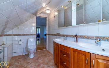 Die Wohnfläche des Ferienhauses beträgt ca. 350 m² und bietet Platz für bis zu 8 Personen. Nach dem Betreten des Hauses befindest du dich in einem Flur mit Garderobe. Nach rechts geht es in das Gäste-WC. Geradeaus geht es direkt in die offene Küche mit kleinem Essbereich und einer gemütlichen Sitzecke. Die Küche ist geräumig und gut ausgestattet. Unter anderem verfügt die Küche über ein 4-Platten Induktionskochfeld und eine Spülmaschine. Es führen zwei Wege aus der Küche heraus. Der hintere Durchgang führt in das große Esszimmer mit großem Esstisch, der vordere Durchgang führt in einen weiteren Flur. Vom Esszimmer aus geht es weiter in einen Raum, der als Ruheraum oder kleines Wohnzimmer bezeichnet werden kann. Anschließend geht es in das große Wohnzimmer mit gemütlichen Sofas und einem Klavier. Aus dem Wohnzimmer heraus erreichst du den Flur, der auch aus der Küche zugänglich ist. In dem Flur führt eine Treppe in die obere Etage. Oben angekommen befindest du dich direkt im zweiten Wohnzimmer mit TV. Von hier aus erreichst du alle vier Schlafzimmer und das Badezimmer mit WC und Badewanne. Alle Schlafzimmer sind mit je zwei Einzelbetten eingerichtet. Eines der Schlafzimmer hat einen Balkon.