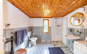 Die Wohnfläche des Ferienhauses beträgt ca. 75 m² und bietet Platz für maximal 4 Erwachsene + 1 Kleinkind. Nach dem Betreten des Hauses befindest du dich in einem kleinen Flur. Direkt zur linken Seite liegt das erste Schlafzimmer, eingerichtet mit zwei Einzelbetten. Nach rechts aus dem Flur heraus geht es in das gemütliche Wohn- und Esszimmer mit zwei Sofas, einem großen Esstisch und einem Kamin. Außerdem gibt es einen Smart-TV mit deutschen und schwedischen Programmen. Über das Wohn- und Esszimmer geht es weiter in die Küche mit einem kleinen Esstisch. Die Küche verfügt unter anderem über ein 4-Platten Cerankochfeld mit Backofen und eine Tisch-Spülmaschine. Der Kühlschrank mit Gefrierfach steht im angrenzenden Flur, der auch in die obere Etage führt. Von der Küche aus erreichst du über eine Hintertür den Garten und die Terrasse. Auf dem Weg in die obere Etage liegt das geräumige Badezimmer mit WC, Dusche und Waschmaschine. Per Treppe geht es in die obere Etage, wo sich das zweite Schlafzimmer befindet. Es ist mit einem Doppelbett und einem kleinen Ofen eingerichtet. Im Flur vor dem Schlafzimmer steht ein geümtlicher Lesesessel. Ein Babybett und ein Kinderhochstuhl sind vorhanden.