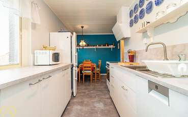 Die Wohnfläche des Ferienhauses beträgt ca. 90 m² und bietet Platz für bis zu 7 Personen. Nach dem Betreten des Hauses befindest du dich in einem länglichen Flur mit Garderobe. Direkt zur linken Seite liegt das Badezimmer mit Dusche und WC. Einen Raum weiter befindet sich das Gäste-WC. Gegenüber des Gäste-WCs geht es in das erste der drei Schlafzimmer. Dieses Schlafzimmer ist mit einem Etagenbett und einem Einzelbett ausgestattet. Neben diesem Schlafzimmer befindet sich direkt das zweite Schlafzimmer mit einem Bettsofa. Die gut ausgestattete Küche mit kleinem Essbereich liegt gegenüber des zweiten Schlafzimmers. Die Küche verfügt unter anderem über ein 4-Platten Carankochfeld mit Backofen und eine Spülmaschine. Aus der Küche heraus geht es nach links in das Wohnzimmer mit gemütlichem Sofa und einem TV mit deutschen Programmen. Über das Wohnzimmer erreichst du das dritte Schlafzimmer mit einem Doppelbettt und den Wintergarten. Im Wintergarten gibt es viele Sitzmöglichkeiten und Tische. Zudem gibt es noch eine kleine Aussenterrasse im Anschluss an den Wintergarten.