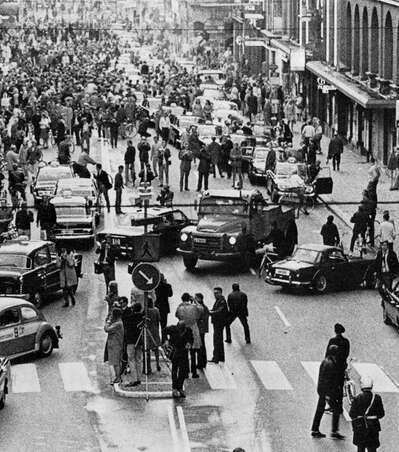 Die Umstellung wurde so koordiniert, das am frühen Morgen um 4:50 der gesamte Verkehr stoppen musste. Ab 5 Uhr durfte der Verkehr wieder rollen. Innerhalb dieser 10 Minuten mussten alle Fahrzeuge die Straßenseite wechseln. Wie das ausgesehen hat, siehst du oben im ersten Bild.