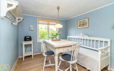 Die Wohnfläche des Hauses beträgt ca. 120 m² und verteilt sich auf zwei Etagen. Geeignet ist das Ferienhaus für maximal 6 Personen + Haustier auf Anfrage. Das gemütliche Ferienhaus mit dem Charme vergangener Zeiten wurde 1876 erbaut. Der Eingang zum Haus ist eine Veranda mit schönen Holzschnitzereien im Original. Nach dem Betreten des Hauses befindest du dich in einem kleinen Flur mit Garderobe. Direkt vor dir liegt die offene Küche, die unter anderem mit einem 4-Platten Cerankochfeld mit Backofen und einem charmanten Holzhofen ausgestattet ist. Ein zweiter Teil der Küche mit Schränken und Spüle liegt einen Raum weiter hinter der Küche. Daran anschließend liegt das 2021 renovierte Badezimmer mit WC, Dusche, Waschmaschine und Fußbodenheizung. Seitlich der offenen Küche findest du den Essbereich mit Esstisch, Stühlen und einer alten schwedischen Küchenbank. Vom Eingangsbereich aus gesehen geht es nach rechts in das erste Wohnzimmer, in dem es einen weiteren, großen Esstisch gibt. Ein großer Kamin spendet wohlige Wärme an kälteren Tagen. Über die Küche geht es weiter in das zweite Wohnzimmer mit Sitzmöbeln. Vom Wohnzimmer aus erreichst du die überdachte Terrasse mit Terrassenmöbeln. Neben dem zweiten Wohnzimmer gibt es einen Durchgang zum ersten Schlafzimmer. Im Durchgang befindet sich eine alte Küchenzeile, die als Dekorationen genutzt wird. Das Schlafzimmer am Ende des Druchgangs ist mit einem Doppelbett und einem weiteren Kamin ausgestattet. In der oberen Etage, die du über eine Treppe erreichst, befinden sich die zwei anderen Schlafzimmer. Beide Schlafzimmer sind jeweils mit zwei Einzelbetten eingerichtet. Im Flur zwischen den beiden Schlafzimmer gibt es reichlich Schränke mit Ablageflächen.